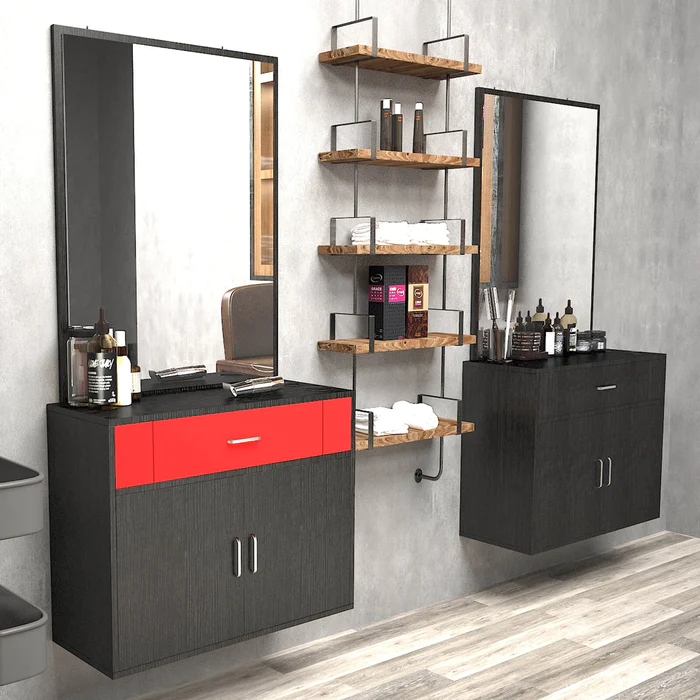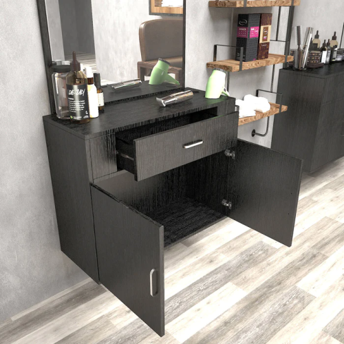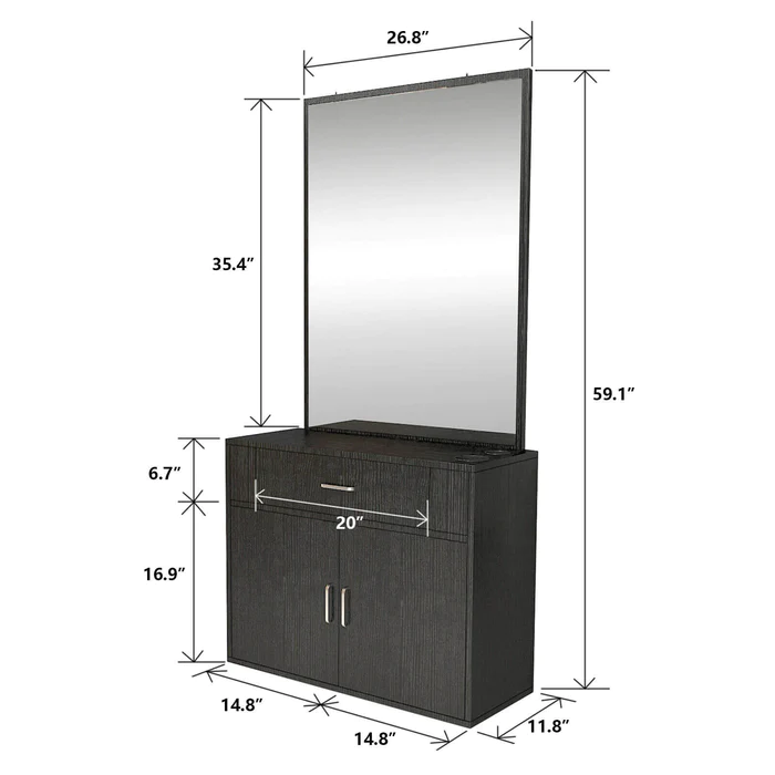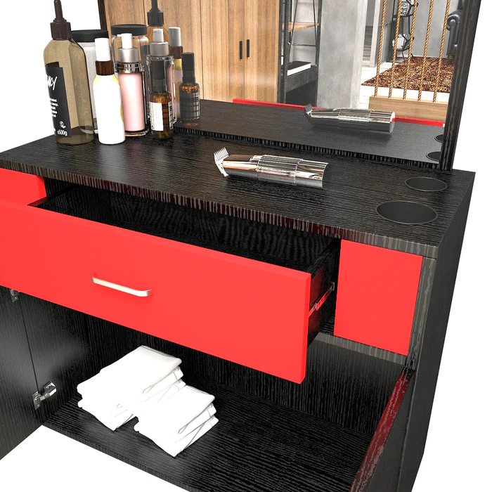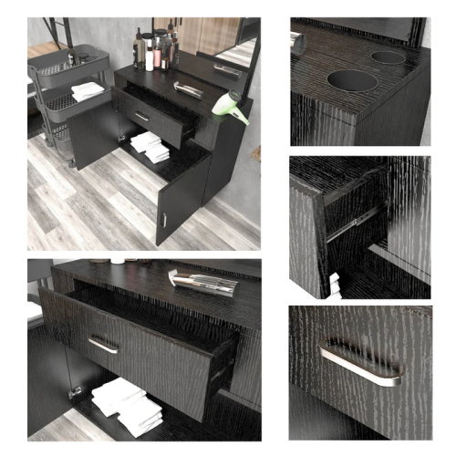 - Elegant Design:this barber station is built with a concise contemporary design along with a high-quality vanity mirror. It fits perfectly in just about any salon. Made of high quality particle board & ABS material, eco-friendly and durable which is is heat and scratch resistant for long time use and easy care