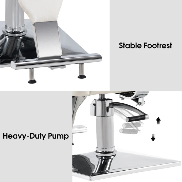 • Multifunctional Adjustment: The hydraulic pressure allows the chair to be raised from 21.3" (height of the cushion to the ground) to 26.6", which is beneficial to satisfy most hair stylists. This chair also features gas-piston locking mechanisms for the 360 degrees rotation and the reclining. This chair leans back from 106 to 136 degrees. The headrest is also adjustable to accommodate people of different heights (6.7''). The headrest also easily removed if it’s not necessary for a particular client; this also gives you more working space. These features make this chair suitable for any scene, If you offer eyebrow threading, shaving, tattooing, and hair-styling, this one’s great for you.