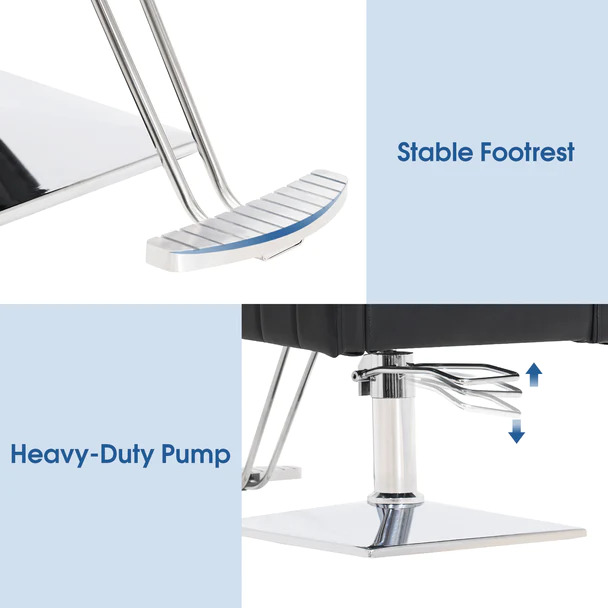 - COMFORTABLE & ELEGANT DESIGN: Welcome look with exquisite stitching brings elegant and contemporary taste to the whole style of barber shop/salon shop. Chromium-plated aluminum alloy pedal enhances anti-skid property. The cushions and armrests are filled with high-density sponge which provide more cosy barber experience.