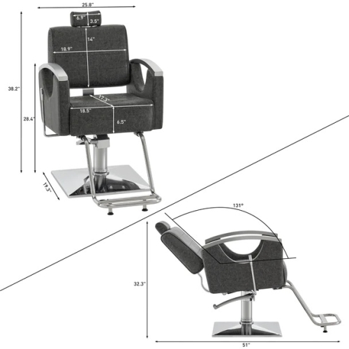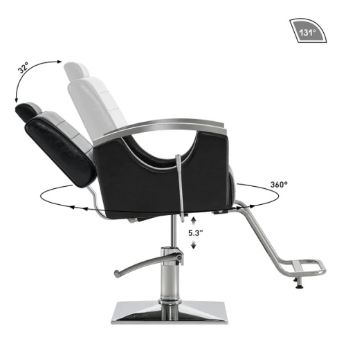 - High Practicability - Removable&Adjustable headrest. The backrest can be tilted up to 131°, so you can provide customers with eyebrow tattooing, shaving and other services bring convenience (Backrest can be easily adjusted to multiple locking positions by a gas-piston lock & release mechanism). 360° Swivel with locking mechanism provides versatility. And the the foot lever can adjust the height of barber chair, maximum to 5.3 inches.