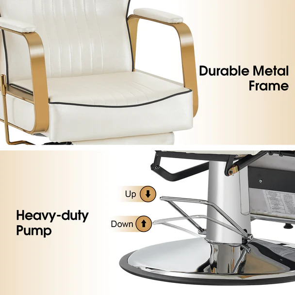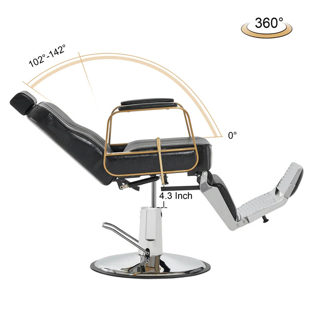 - Swiveling Recliner Chair:The chair supports 360-degree rotation, and the handlevel adjusts the inclination of the backrest and legrest. The backrest can be reclined up to 142 degrees to meet your various shaving, grooming, shaving needs.Easier height adjustment with hydraulic pump up to 3 inches.