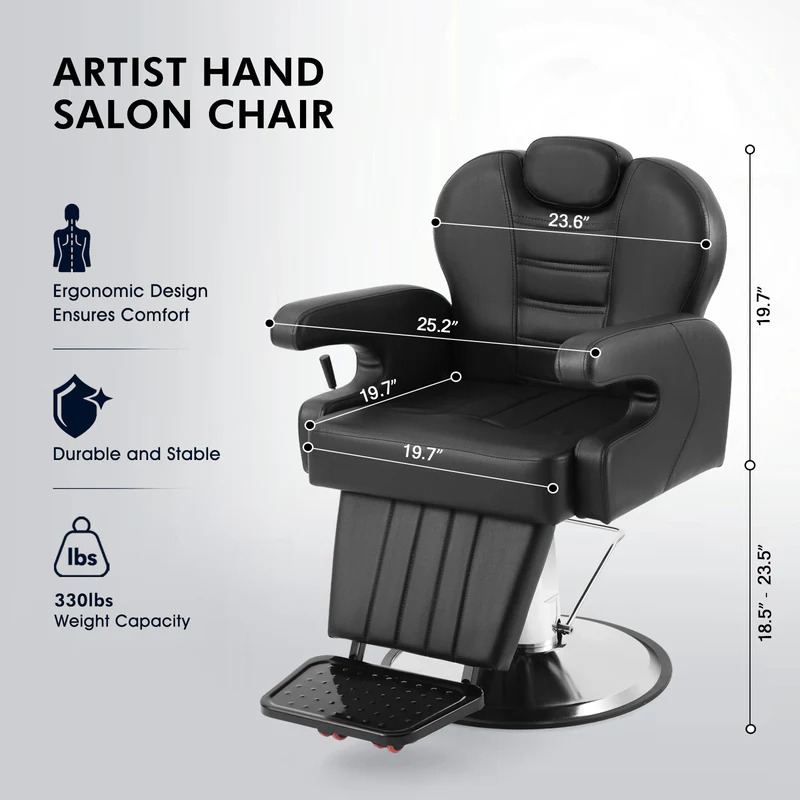 - 360-Degree Swivel and Hydraulic Lift - The Artist Hand Barber Chair offers a full 360-degree swivel and a heavy-duty hydraulic pump, providing easy height adjustments and flexibility during haircuts, styling, and shaves.