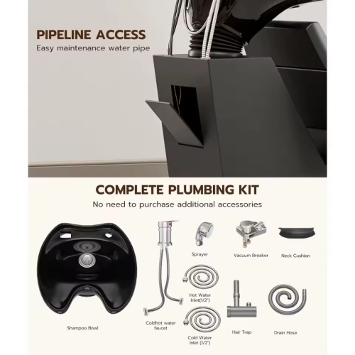 - Complete Backwash Unit: We provide all the accessories for this hair washing station; Faucet, inlet hose, drain hose, strainer, hair trap etc; No additional purchase required; Pipeline access on the back and maintenance water pipe easily; Hardware is made of high quality stainless steel