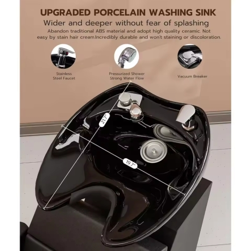 - Upgrade Porcelain Sink: Brighter, thicker and deeper; The more costly ceramic shampoo bowl are resistant to staining from hair coloring creams, anti-abrasion and scratches; Shine like new with long-term use; No need to worry about water spills with the deep design; The angle of the basin can be freely adjusted to fit snugly around the neck