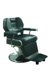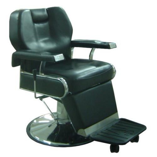 This reclining Barber Chair features a removableheadrest, a round chrome base, dual tilting mechanisms and cushioned arms. The footrest raises as the chair isreclined, and the chair will recline up to 45 degrees.