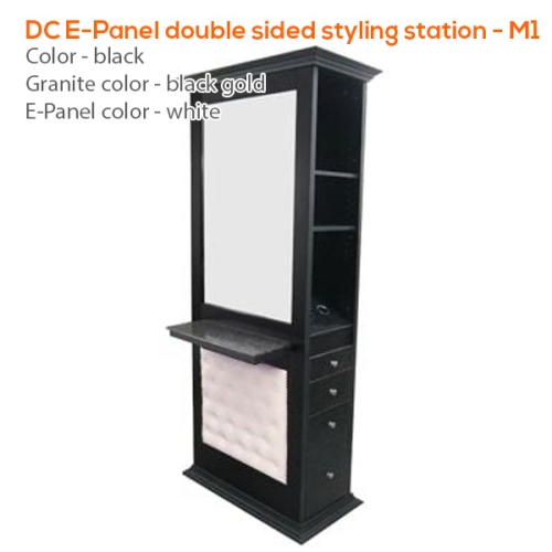Nottingham E-panel Double Styling Station is a traditional styling station with Granite counter Features: Large storage drawers Granite counter top Assembly Required.