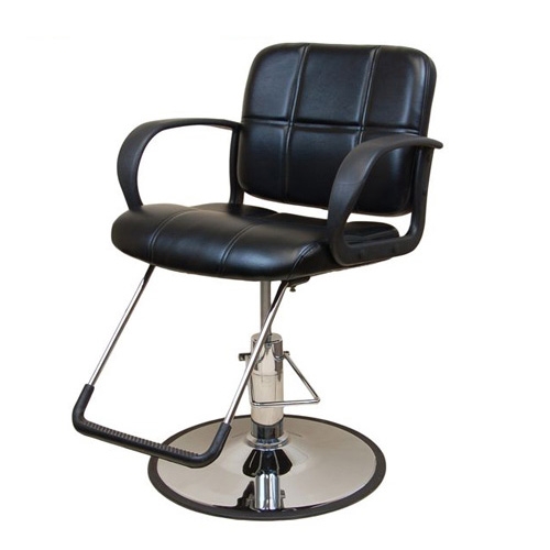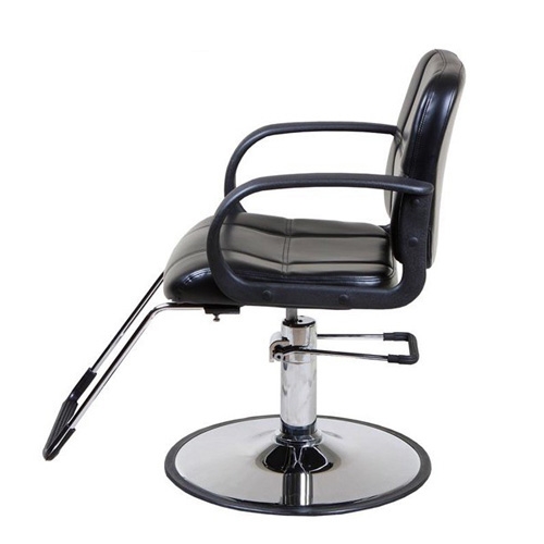 Black styling chair comes with a "U" shaped footrest with a dense rubber footpad. Rectangular shaped back. The armrests are made of black hard plastic.