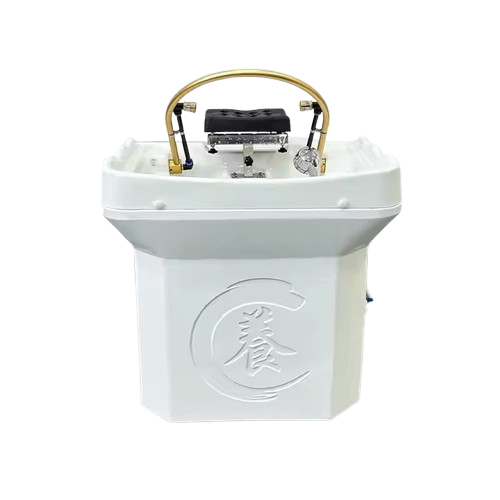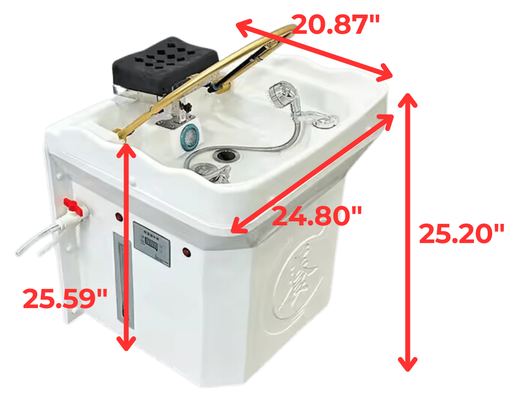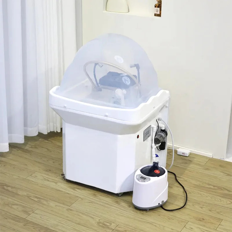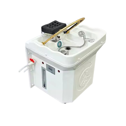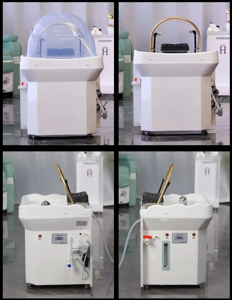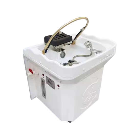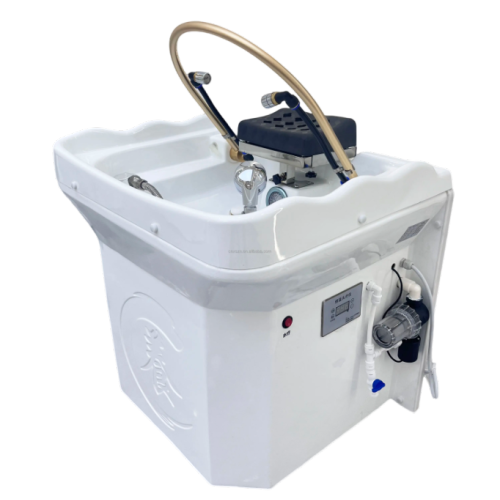 - A self contained Japanese scalp massage sink with a built in heated water tank, LED light therapy, water circulation arch, and optional steam fumigation, designed for suites and treatment rooms without traditional plumbing.