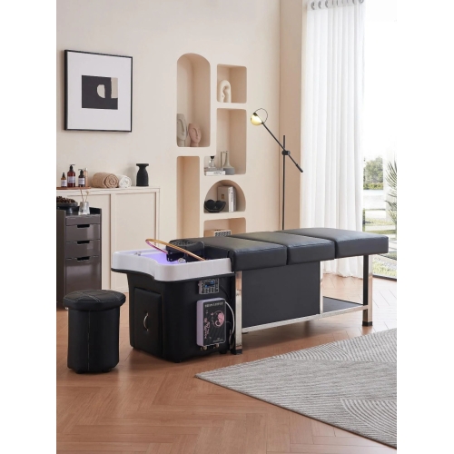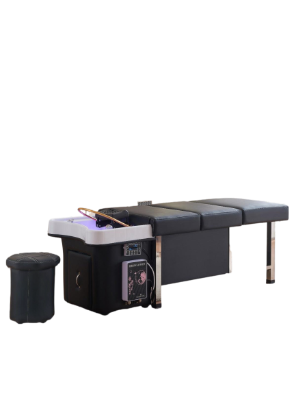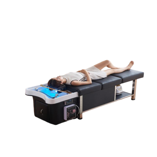 - A self contained Japanese scalp massage bed with an integrated shampoo basin, clean and waste water tanks, LED light therapy, circulating waterfall ring, and steam fumigation, created for spas that want full head spa services without permanent plumbing.