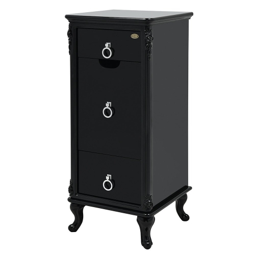 The styling station cabinet Florence, with its softly-accented, glossy exterior and solid wood drawers, and packed with handy equipment slots, is a trusty and stylish companion to any stylist.