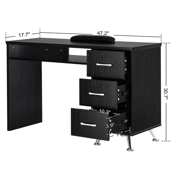 - Storage Capacity: This desk comes with three high-capacity drawers to help you classify your manicure tools in your workspace and allows you to put more of the tools you need. There is a half panel at the back of the drawer where you can put the manicure light in the middle drawer. And You can also put some frequently used tools on the spacious top board.