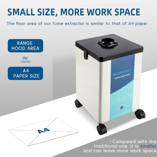 - WON'T TAKE UP SPACE - Our welding fume extractor's size is smaller than A4 paper. Suitable for small solder station and home DIY, 10.5x10.5x16 inch bulk can be stuffed under the table and won’t hinder your leg free and take up no space. Also equipped with 4 quality universal wheels with buckles, convenient to move and fix at any station.