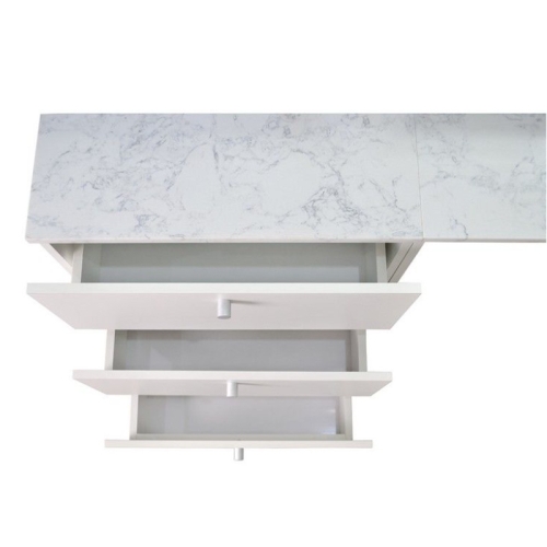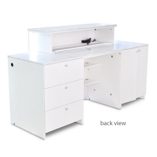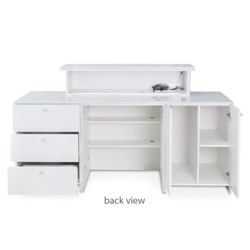 Create a stunning first impression with the sophisticated Regis Reception Counter. This beautiful dual-level counter greets customers with glowing LED lighting and luxurious white marble, offset by a simple all-white modern design that looks fabulous with any existing décor or color scheme. The Regis Counter is also highly functional with power receptacles, USB chargers, and generous counter space and storage compartments for supplies.