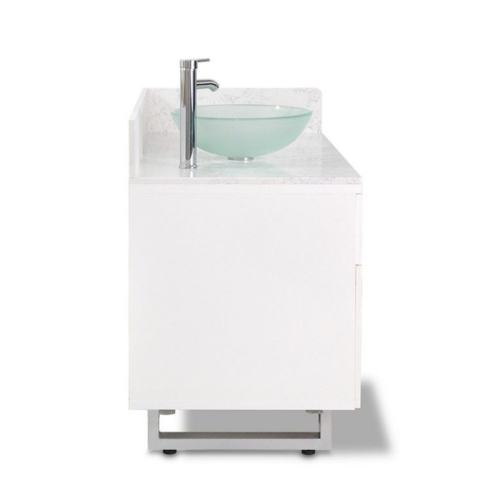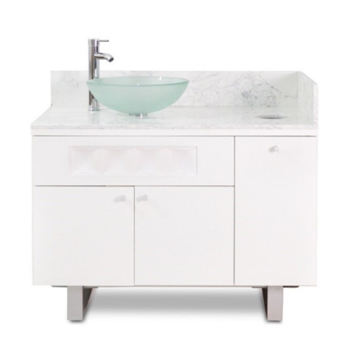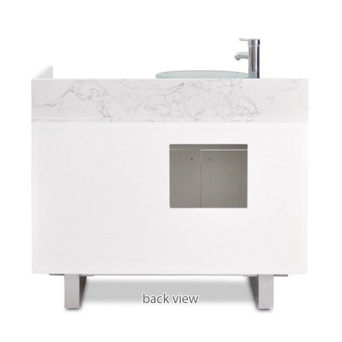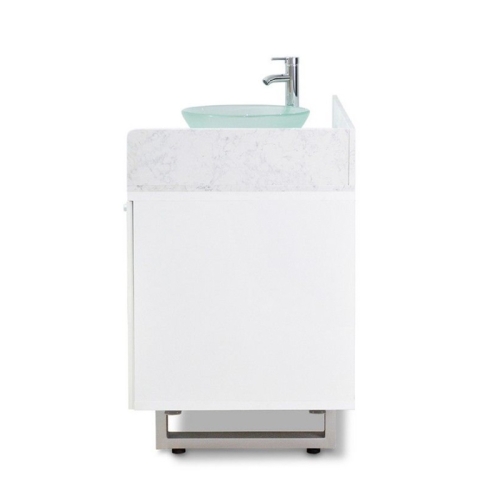 This cabinet with raised sink bowl features a stylishly simple look with beautiful white marble countertop that adds a touch of elegance. Its functional design encourages cleanliness, with a trash chute located next to the sink and a versatile single handle faucet that can easily be turned on with a wrist or elbow.