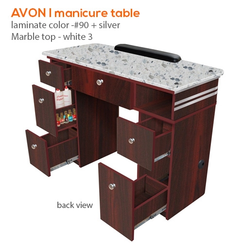 The Avon Collection is a furniture line consisting of beautiful streamlined wood grain that is accented with timeless grey speckled marble. This line includes manicure and reception tables that will help to keep your salon in style and organized.