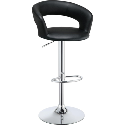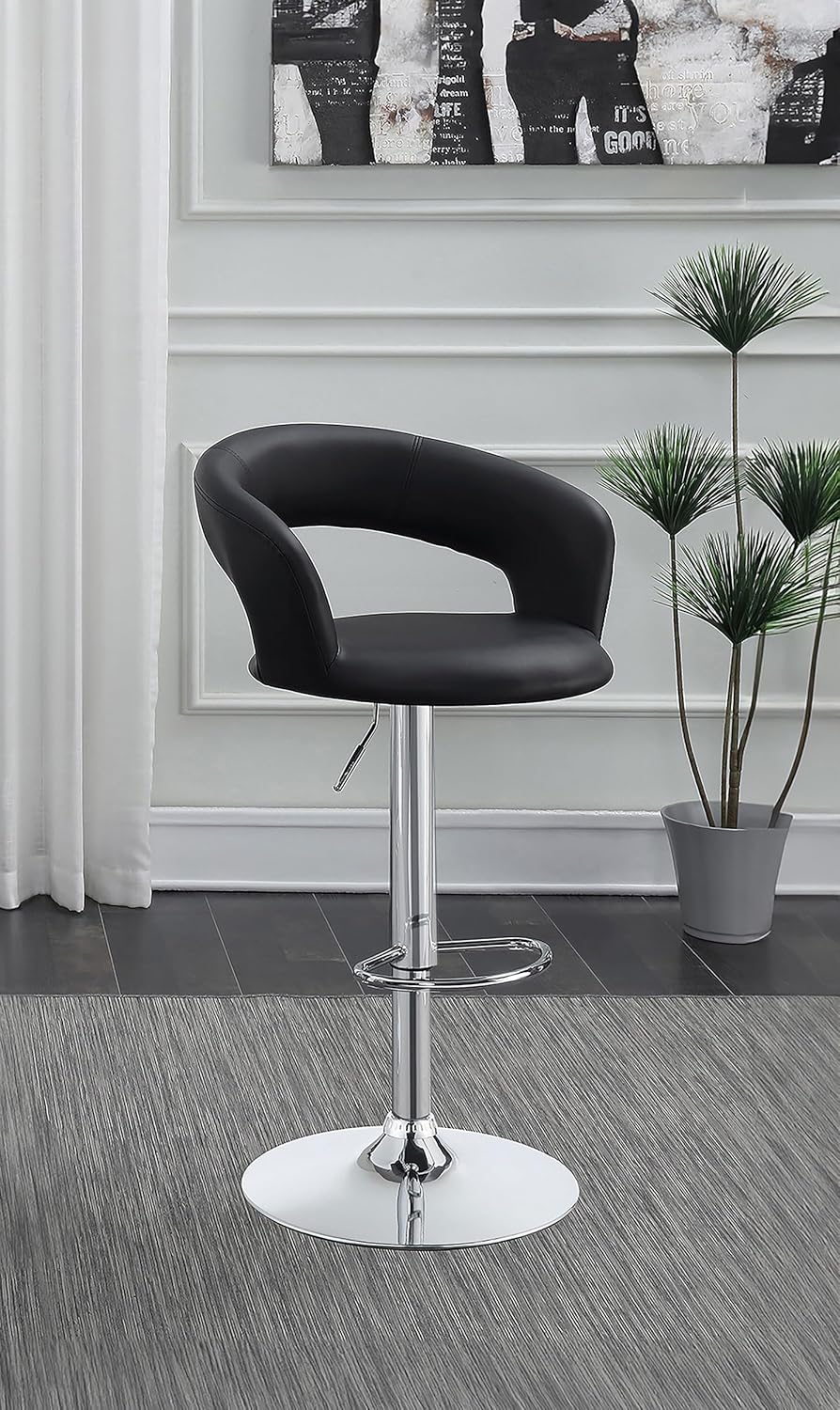 - This adjustable height bar stool boasts a black faux leather upholstered seat supported by a chrome base, radiating an enduring sense of style
