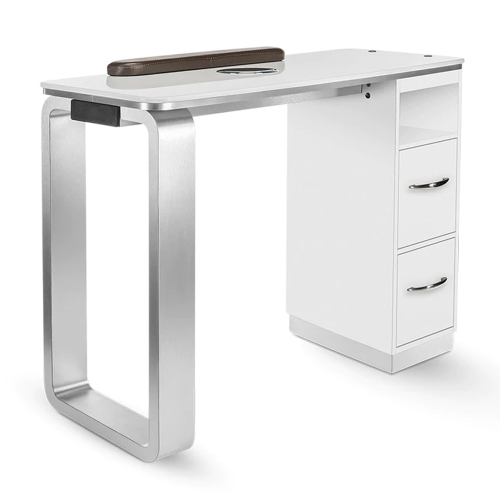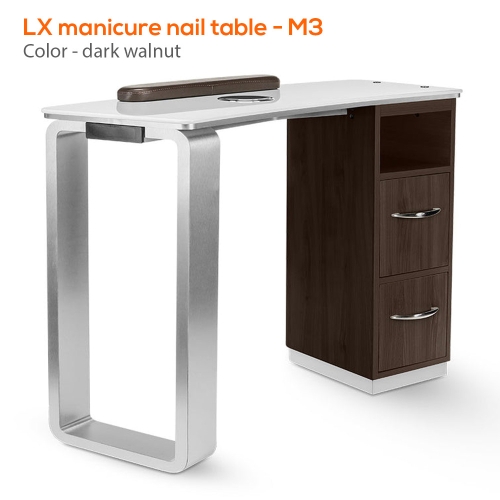 Indulge in Luxury with the LX Manicure Nail Table - M3: Where Artistry Meets Elegance! Elevate your salon experience with a touch of opulence and innovation. The composite marble top, adorned with captivating speckles, not only exudes high-class aesthetics but also prioritizes hygiene. The acetone-resistant gel coat ensures lasting beauty, while brushed metal accents add a subtle gleam of sophistication. Chrome draw handles offer a seamless touch, while the removable organizing caddy keeps your tools at your fingertips. Enhance comfort during long sessions with the integrated wrist rest. Designed for perfection, it's even ventilation-ready. Unveil a world of luxury and creativity with the LX M3 manicure nail table.