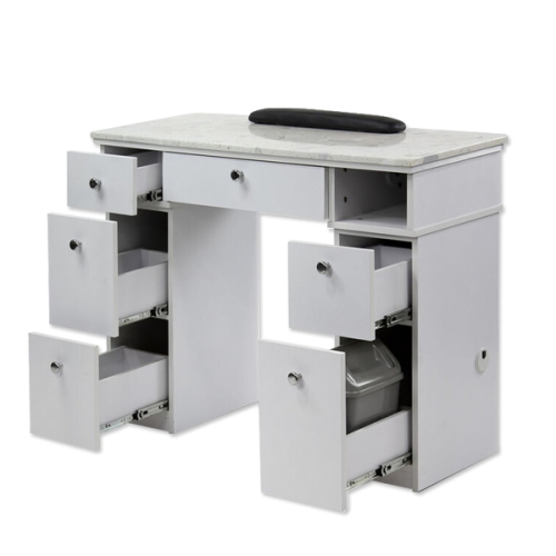 This modern manicure table features a sleek, duo-tone color design with quality wood and a granite counter table top. For quality assurance, our products are designed and assembled here in the USA. Includes: