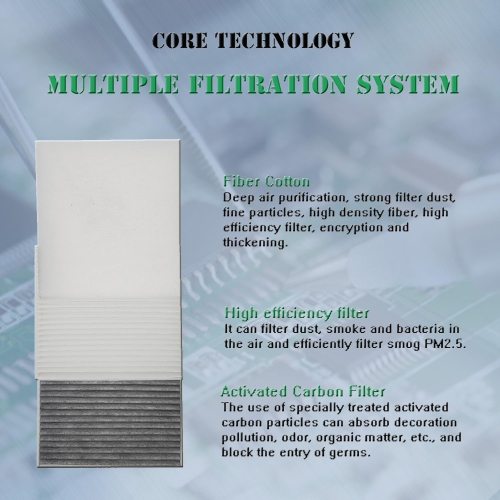 - 3 Stage Filtration System: Cotton filter, central high efficiency filter and activated carbon filter an purify a large number of fine metal particles suspended in the air that are harmful to the human body