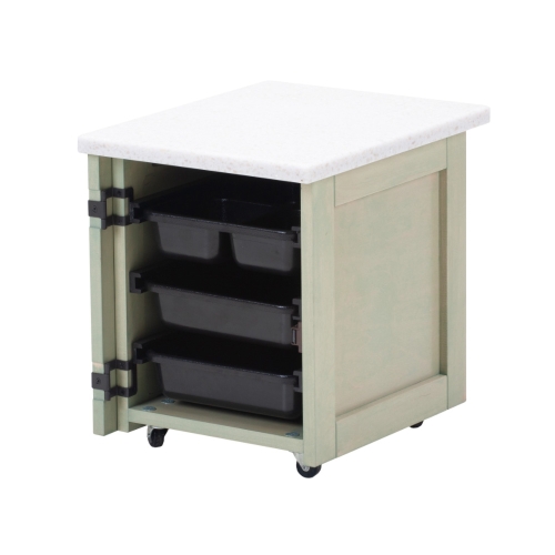 Standard: three pull out trays - (2) full compartment; (1) quartered. Door swings completely open and wraps to the side. Heavy duty casters. Top will be the same as Pedi Roll up or you may select from standard options, or customize options with additional cost.