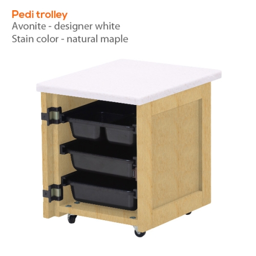 Gorgeous, functional and resilient. Our Pedi Trolley adds signature style by allowing you to choose appearance options that accentuate any spa dĂ©cor. Includes a sleek, impact resistant Avonite™ surface, three pull-out trays, locking wheels and solid maple wood construction There’s also a clever front door that folds back flat against the side for effortless maneuvering around the cabinet.