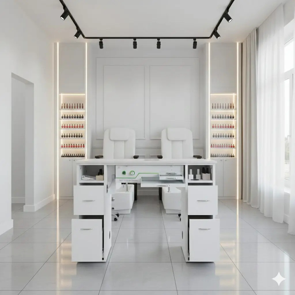 This sleek vacuum nail table features a durable quartz stone top and a built-in air vacuum system for effective dust collection during nail services. Designed with multiple storage drawers, a trash bin, and bottle holder tray, it keeps your workspace clean and organized. Finished in modern white, it’s an ideal choice for professional nail salons.