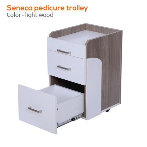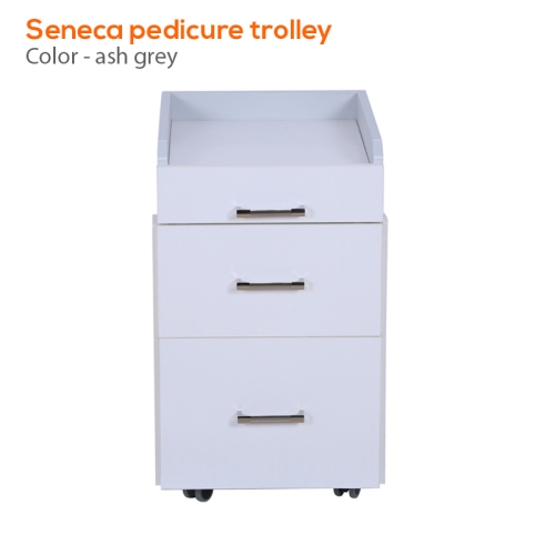 The Seneca pedi cart is an upscale piece with chrome handles, hardwood veneer, and two accent colors: ash grey and ash wood. This pedi trolley can be easily moved about the nail salon with four highly functional casters. The simple yet beautiful design is the staple design style of the Seneca salon furniture line.