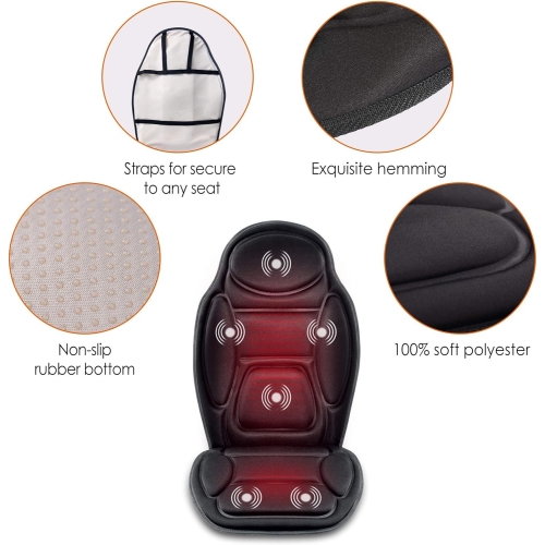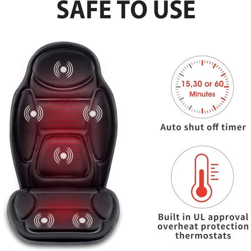 - Heat Thearpy - The back massager with auto shut off target full back and seat, to radiating gentle warmth, to relax soreness muscles and improve blood circulation. The seat massager is equipped with Overheating protection system and Auto shut off timer, dual-insurance for safe use.