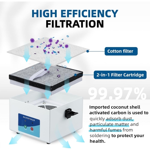 - Excellent Purification and Filtration: The soldering fume extractor is equipped with a highly effective purification and filtration system. It traps and removes harmful particles, odors, and toxins from the air, up to 97% filtration effect, providing you with fresh and clean breathing space.