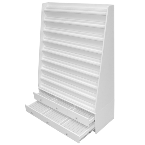 The "Sonoma" 2 tiered polish rack will hold over 500 bottles of nail polish. The open, slanted front has an acrylic lip so that your customers can see the variety of color choices. A 53.5" H top sets on a 14.5" H cabinet with 6 convenient, separate drawers for storing your excess product.