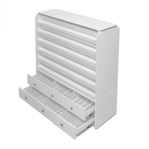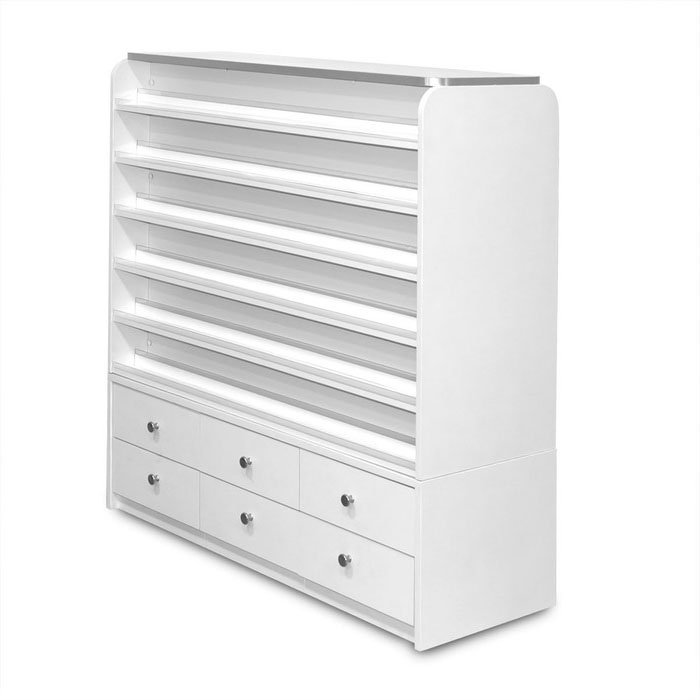 The "Sonoma" double sided cabinet is a great way to display all of your polish and powders! Six tiered shelves, with clear acrylic lip, allows your customer to view the powder and polish combinations together. The cabinet has the convenience of 6 individual drawers, on 1 side, for storing your extra products. Each of the 3 top drawers are divided in 5 rows for your extra powders and the 3 bottom drawers are divided in 8 rows for your extra polish.