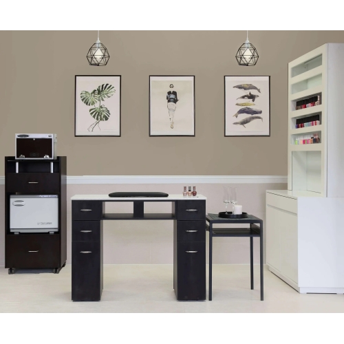 The sleek, modern design of the single nail table makes it the perfect workstation for the busy spa or salon. With a rich walnut finish and a white, minimalist granite top, it’s a timeless look that will give your salon a sophisticated look and feel. Sturdy wheels make it easy to move around to suit your layout.