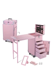 - 56"x16"x31" portable art nail & makeup workstation with 4pcs 360-degree rotated wheels including 2 lockable wheels, featuring 2 expandable floor-standing tabletops and full-size mirror for turning into an independent make up workstation instantly even in outdoors; Suitable for outdoor use, such as street performances, temporary make-up room or accessories stall in flea market