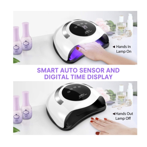 - 【 4 Preset Modes 】 4 timer setting(10/30/60/99S) Simply push the button for various purposes. Large Digital LCD displays the timers.The Nail Dryer has build-in over-heat protection which is designed for less tanned skin while curing the gels. The curing lamp also has a build-in auto sensor which detects your hand in or not. The lamp auto turns on/off for curing which provides a touch free curing. It brought you a significant convienience when using our device.