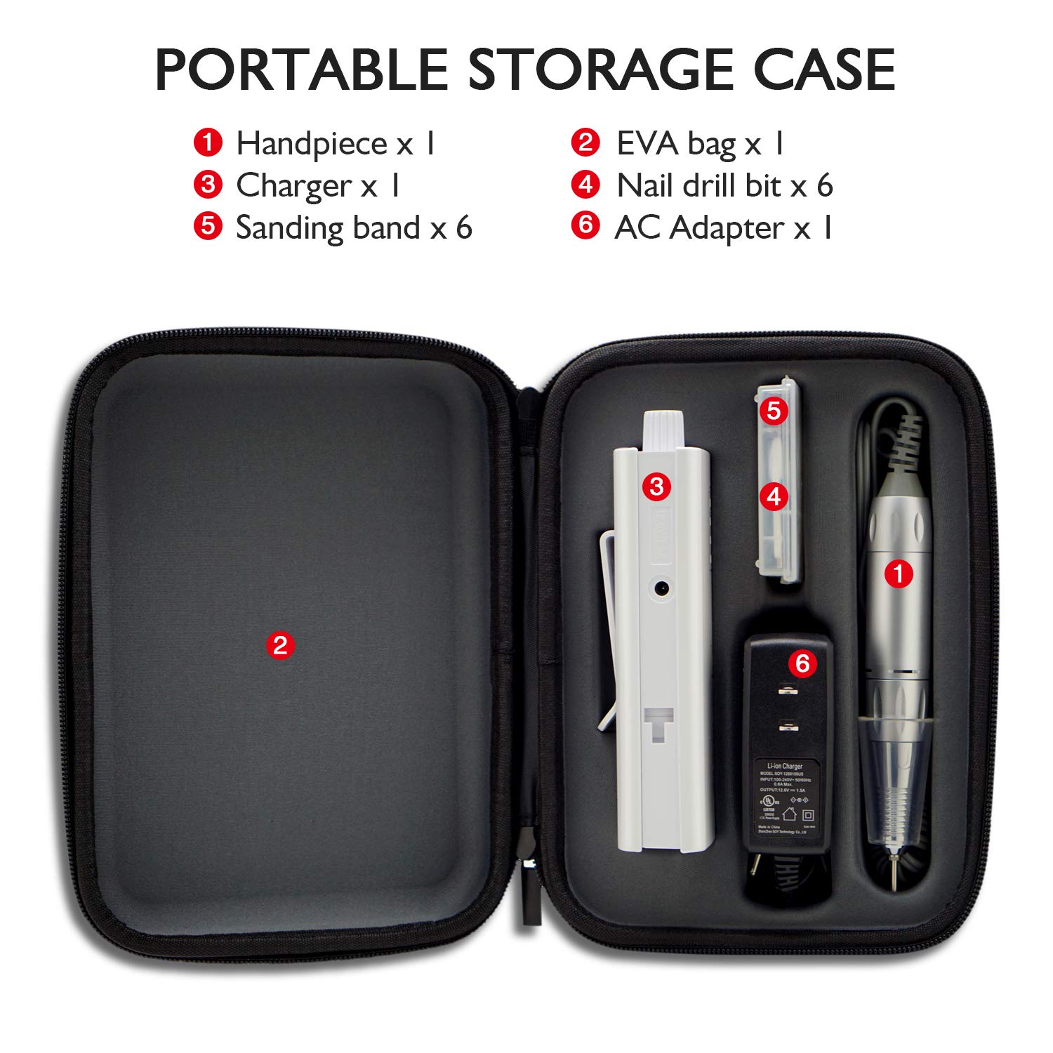 - Rechargeable and Ultraportable: This cordless nail drill Full recharge time ONLY 2.5 HOURS, continuous operate UP TO 6-8hours( Four electricity displays 25%, 50%, 75%, 100%, you can know the power situation in real time). The little size is even smaller than Iphone6 plus, it comes with the hook on the machine which could hang on your clothes, or put it in your pocket/ bag. Take it to make nail art with friends anywhere.
