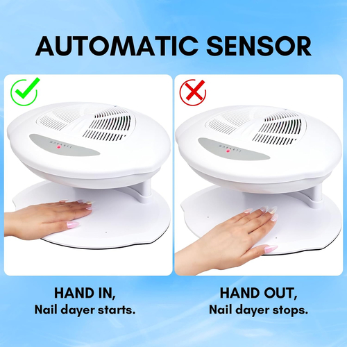 - Intelligent Dual Sensor - The fan nail dryer controlled by automatic sensors. Sensor detection allows the nail polish dryer machine to turn on automatically when you put your hand inside the fan. Tips: Please keep your hands being covered above the sensor to let it work normally.