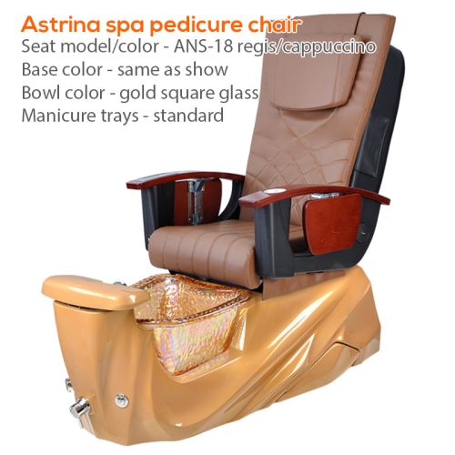 The Astrina is a stylish golden fiberglass pedicure spa that features a beautiful Square Glass Sink Bowl. This classic golden spa will add grace and a modern flair to your salon.