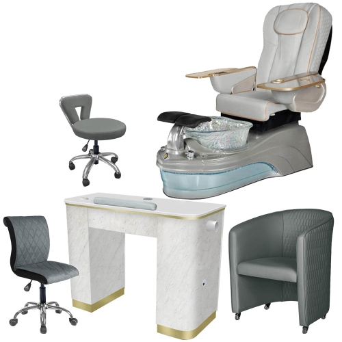 Includes: Ampro spa pedicure chair, Fidenza single nail table, Chiq 2 quilted chair, GS9020 tech stool, Spider stool