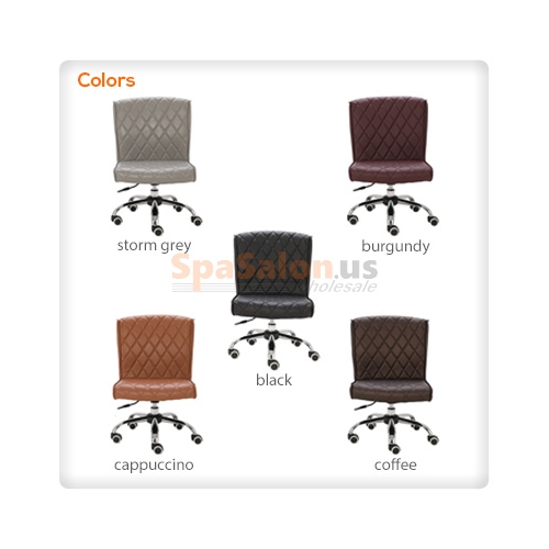 The Delia Pedicure & manicure stool is designed for style, but lacks nothing in the comfort department. The diamond tufted stitching is overlaid on high density foam for firm back support through long pedicure sessions. This stool is available in 5 colors to accentuate any salon décor, with a wide seat, and a heavy duty pneumatic pump. This stool pairs perfectly with the matching DELIA Customer Chair.