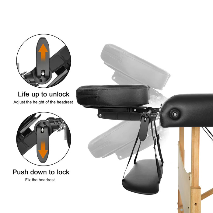 - The massage table cover draped in a luxurious PU leather, durable, soft, and easy to clean. The secure lock ensures safe and convenient carrying of the massage bed.