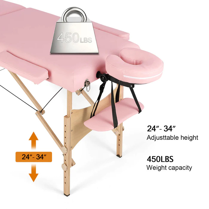 - The massage table will stay sturdy and steady with a weight capacity of 450 lbs. The adjustable headrest features a premium composite support, resistant to bending and warping.