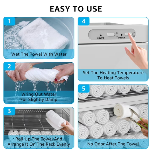 - Safe and Durable - This hot towel warmer cabinet features a stainless steel towel rack that resists rust and is easy to clean. A removable drip tray beneath the cabinet effectively collects moisture, water droplets, and condensation.