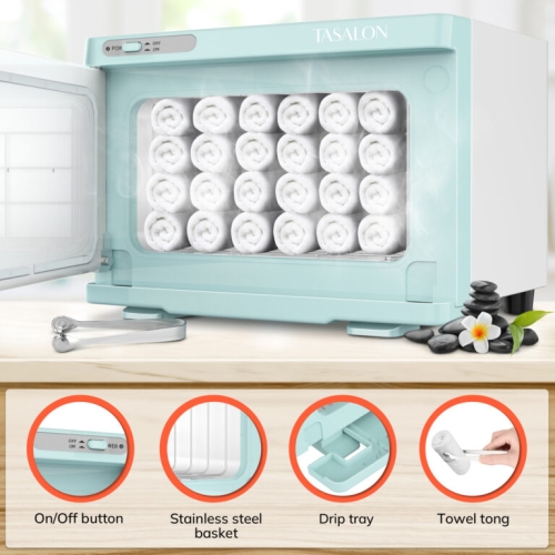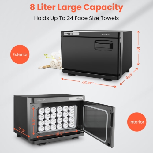 - 8L Mid-Capacity: This towel steamer is compact in size and can hold up to 24 facial sized towels at once when rolled. The perfect size is perfect for keeping towels warm so they are ready for the client’s soothing and hygienic treatment.