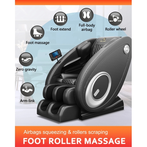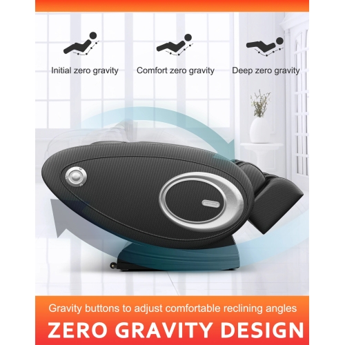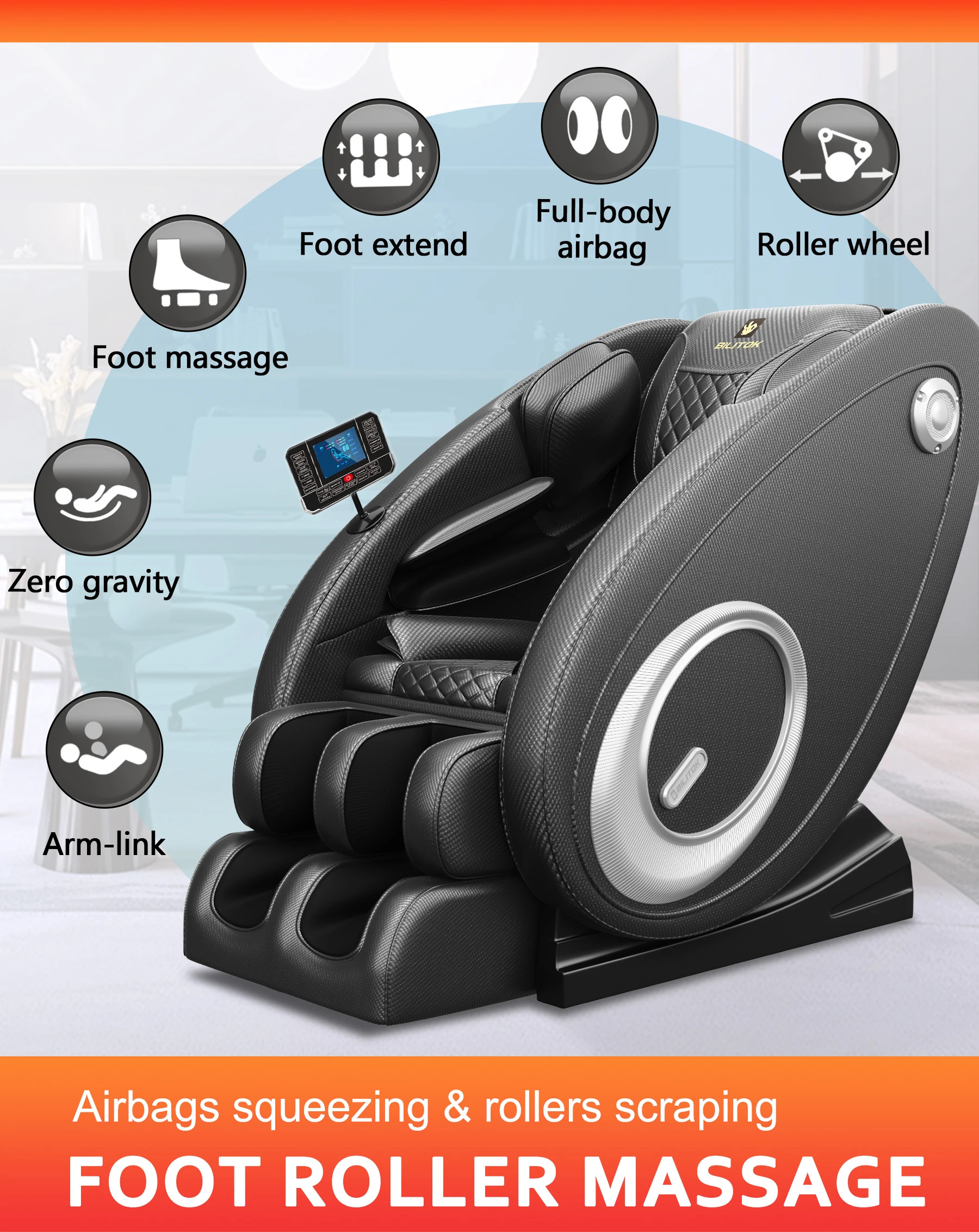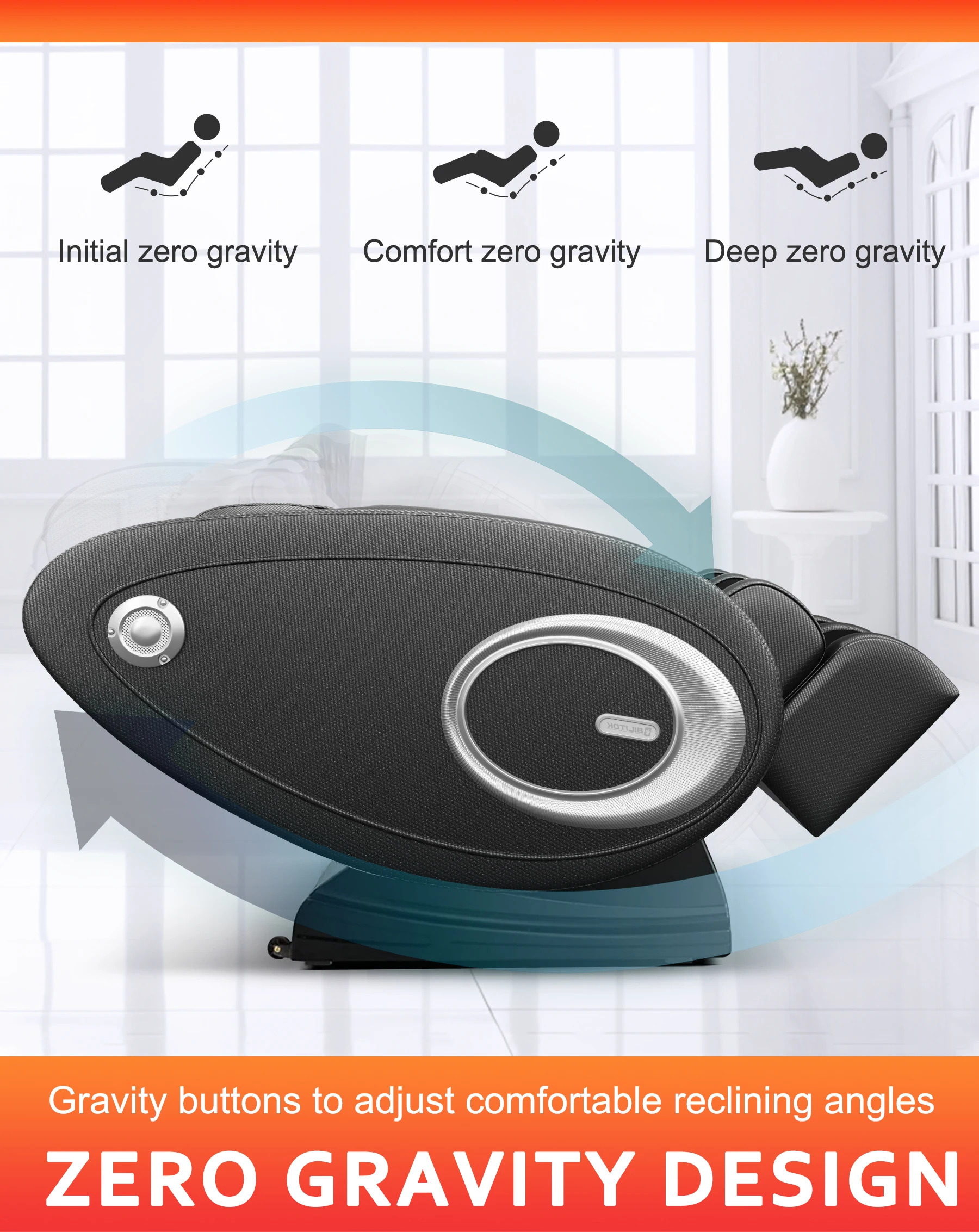 - Eight fixed rollers on the back provide massages for the back and waist. Airbags on the shoulders, arms, hips, and calves can inflate or deflate, relieving tension and muscle fatigue. Press the "Zero Gravity" button for a fully reclined position, elevating your feet above the heart to reduce cardiac stress and enhance your overall experience.
