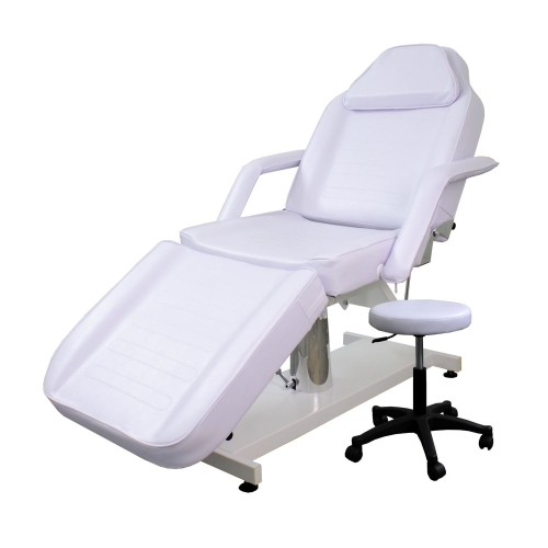 A sturdy facial bed featuring a hydraulic lift base. Fully adjustable back and leg rests with removable pillow and face cut out.