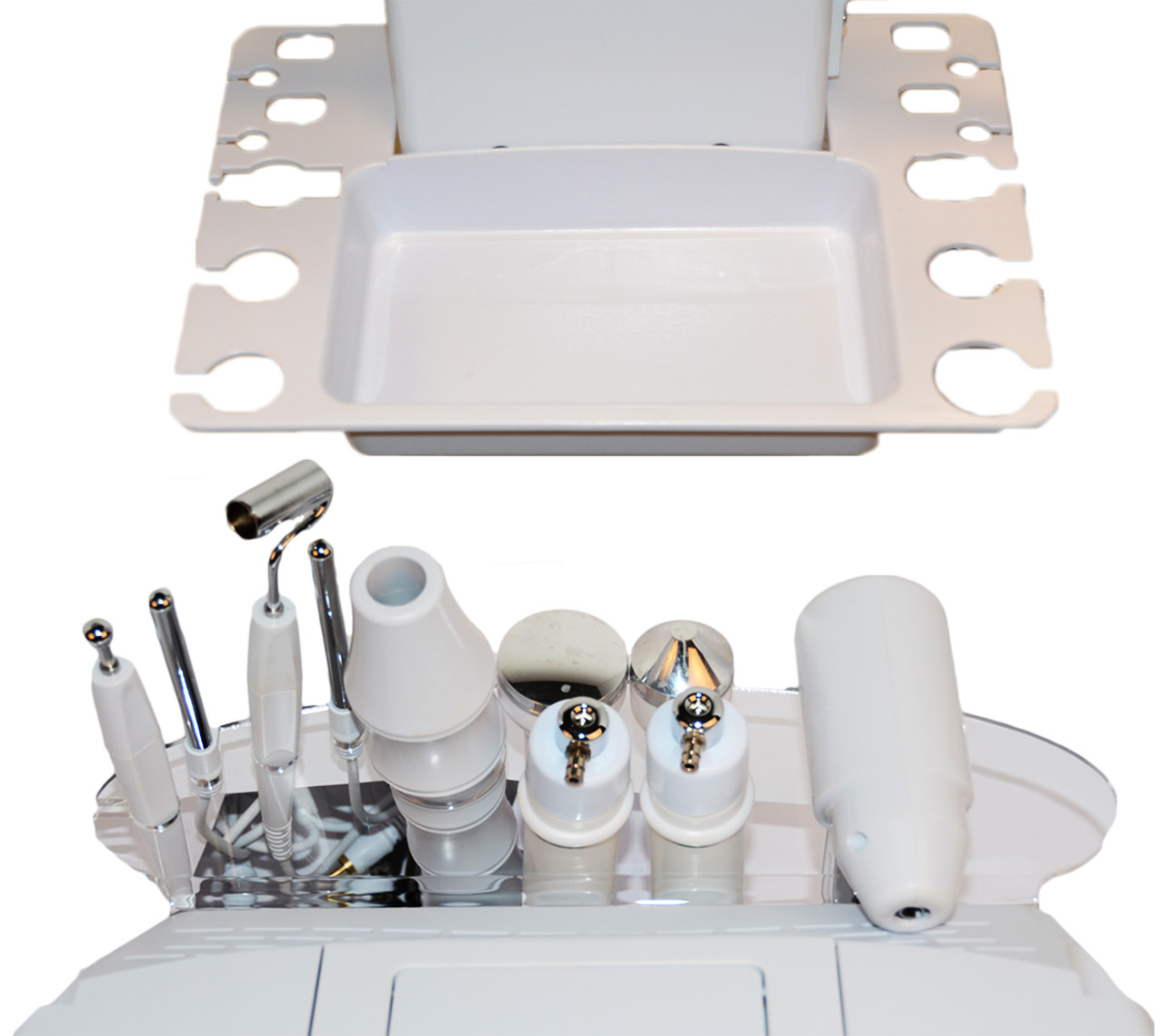 Our Microdermabrasion comes with two different interchangeable toolsets (traditional, and a new patented solid-core double-tipped wand with skin tightening vacuum wand), so you can use whichever protocol you wish for your client’s treatments.