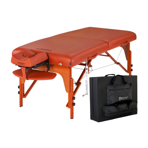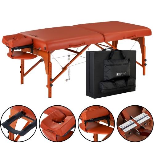 The Master Massage’s patented built-in ThermaTop adjustable heat bed soothes muscles, improves circulation and increases vitality. The wide shouldered Big Top bed provides 26% more cushioned space within the same size footprint as standard tables, and that cushioning consists of 3" thick Multi-Layer Small Cell foam which a layer of memory foam is included.