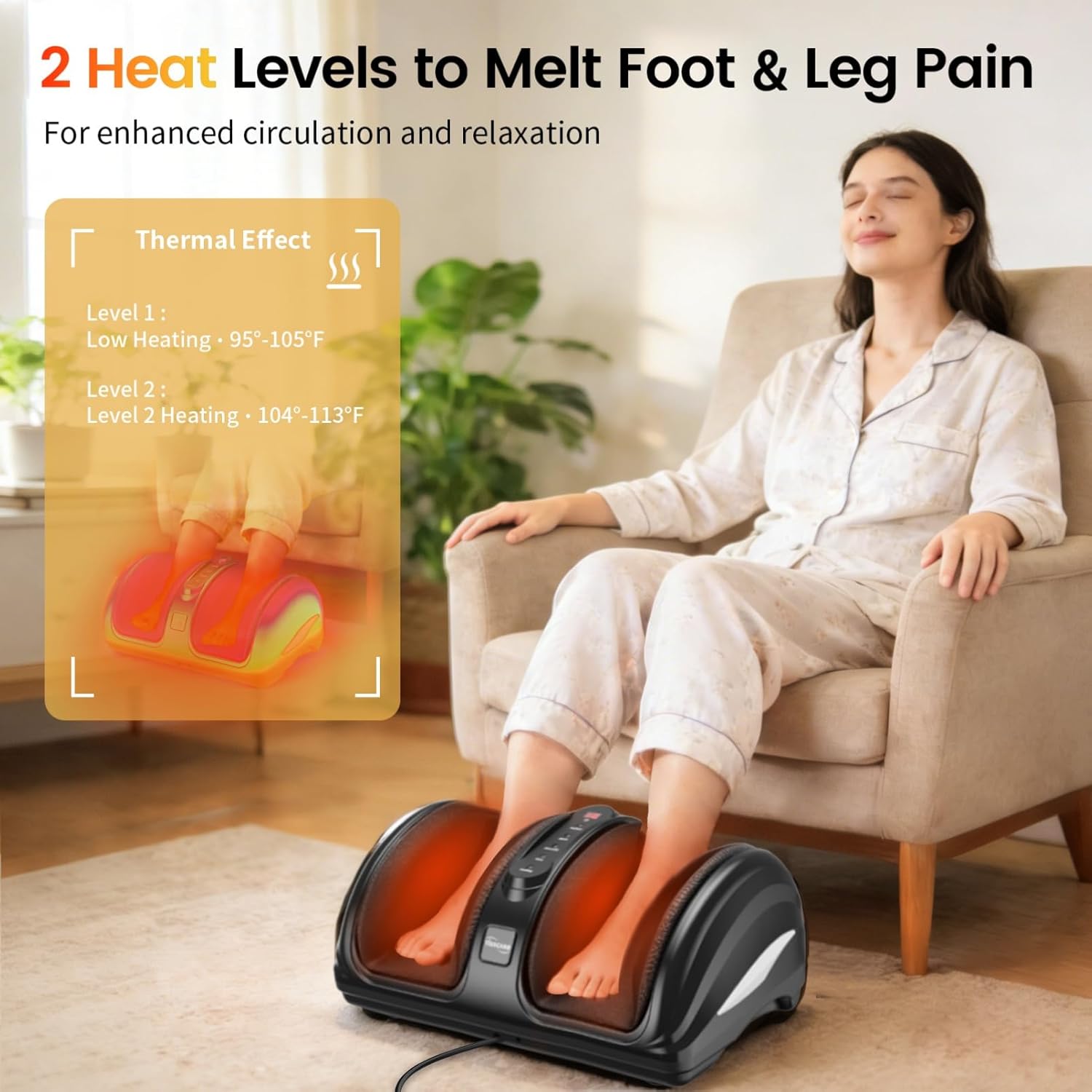 - SOOTHING HEAT & FLEXIBLE TIMER – This heated feet massager offers 2 heat levels (Level 1: 95–104°F; Level 2: 104–113°F) to deliver gentle, soothing warmth for tired feet. With a 6-stage adjustable timer (5–30 min), enjoy anything from a quick refresh to deep, indulgent relaxation—fully in control of your comfort. MORNING ENERGIZER & EVENING RELAXER – Start your day with an invigorating massage or wind down with calming heat therapy