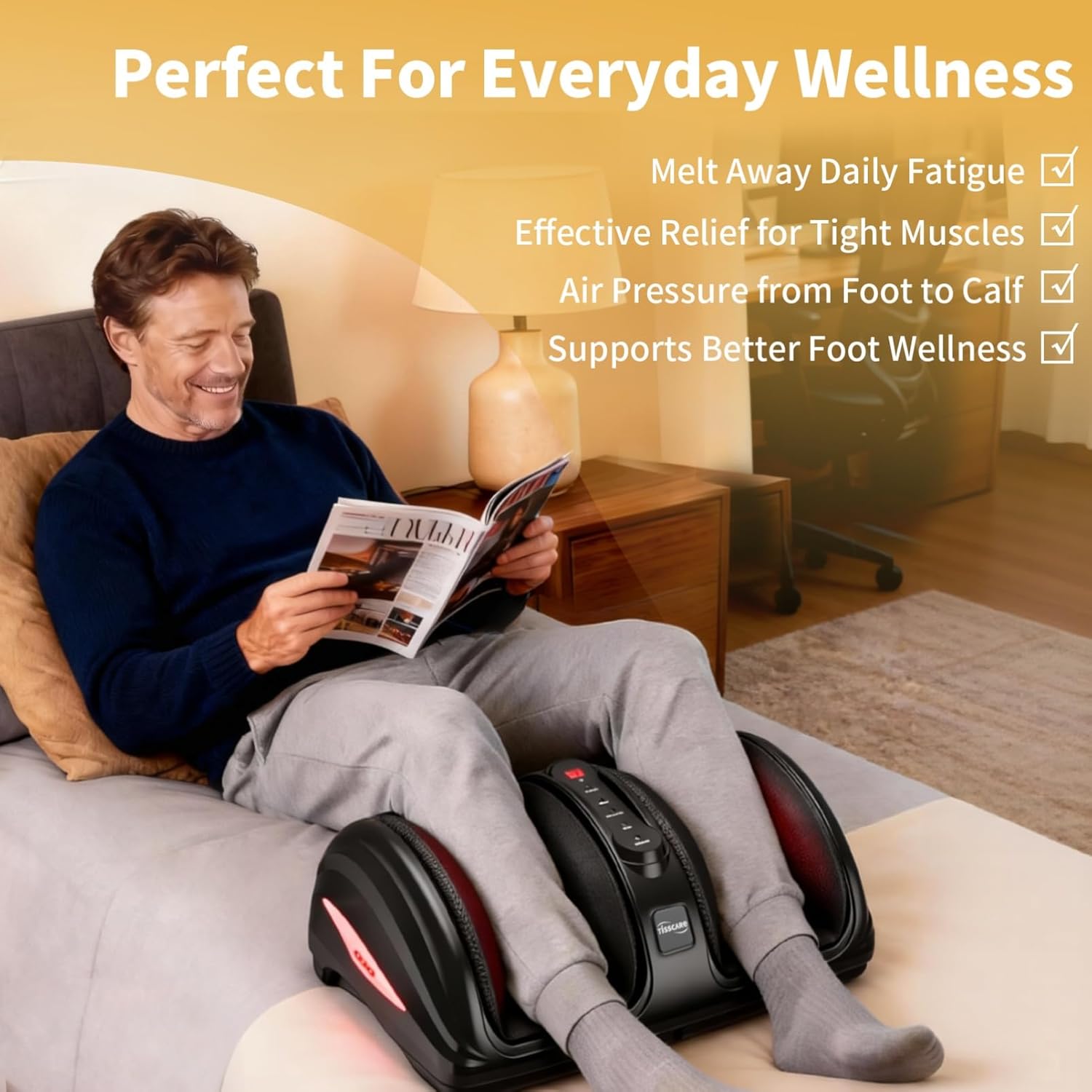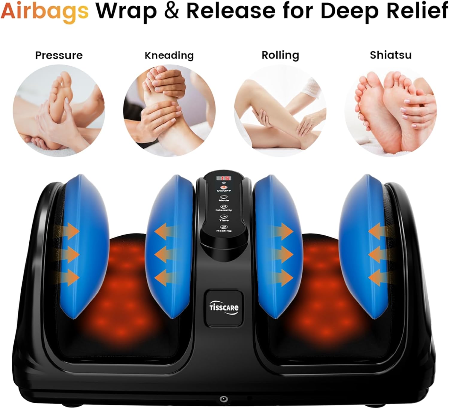 - DEEP TISSUE MASSAGE – The TISSCARE 2026 upgraded electric foot massager features kneading rollers, 9-level airbags, and heating plates working together to deliver deep shiatsu, powerful kneading, and targeted reflexology massage. Rhythmic airbags and soothing warmth help relieve deep foot tension and daily fatigue. The adjustable stand supports multiple angles, allowing relaxed use while sitting or lying down—so you can unwind completely, anytime, anywhere