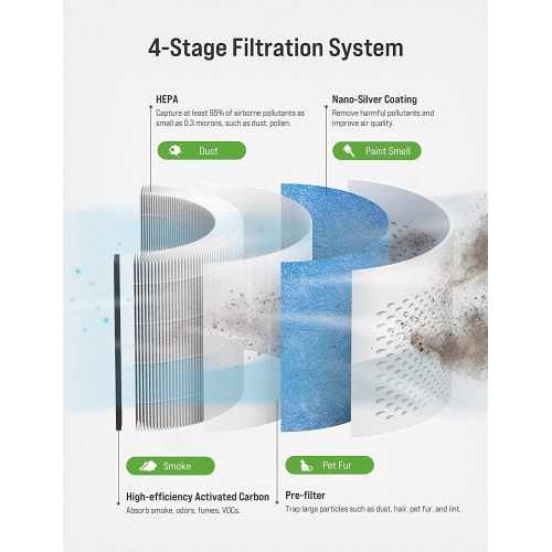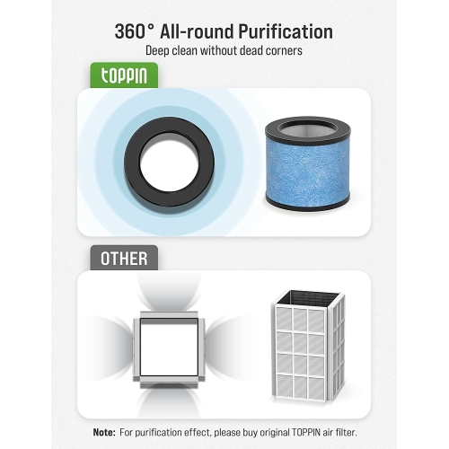 - Multiple Filtration System : HEPA Air Purifiers for home with UV Light & 4 in 1 Nano-Silver Coating Filter clears out of 0.3-micron airborne contaminants, True HEPA Filter reduces and & absorbs smoke & odors via the nano-silver coating and carbon layer, the UV light and the blue net keep the air clean around you. (replacement air filter available to purchase – search "TOPPIN Air Purifier Filter")